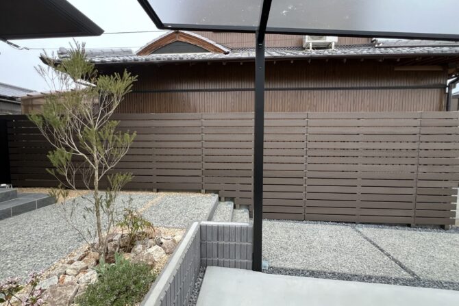 津市内・フェンス工事 OB様宅の隣地境界に エコモックフェンス 色は木目のモカb…